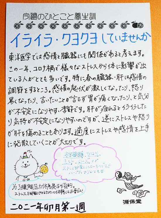 【今週のひとこと養生訓】「イライラ・クヨクヨしていませんか」