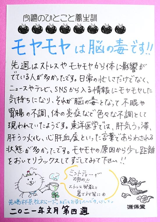 【今週のひとこと養生訓】「モヤモヤは脳の毒です!!」2021年7月文月・第4週