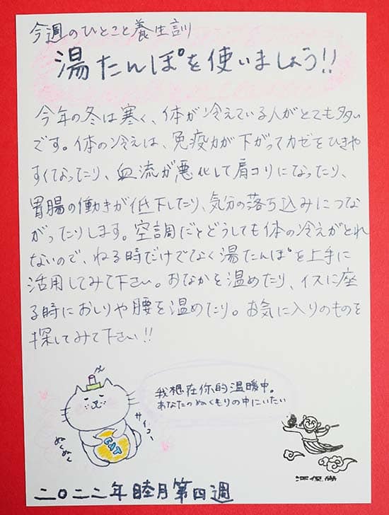 【今週のひとこと養生訓】「湯たんぽを使いましょう!!」2022年1月睦月・第4週