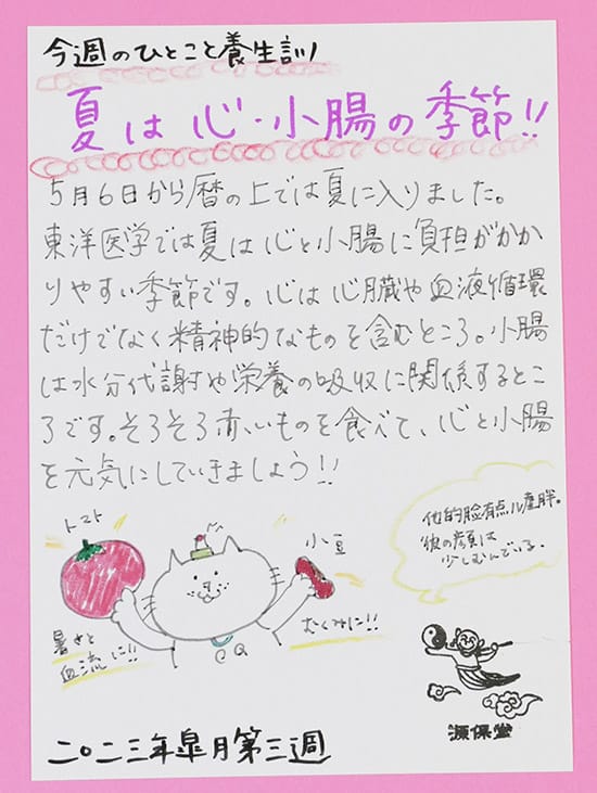 【今週のひとこと養生訓】「夏は心・小腸の季節!!」2023年5月睦月・第3週