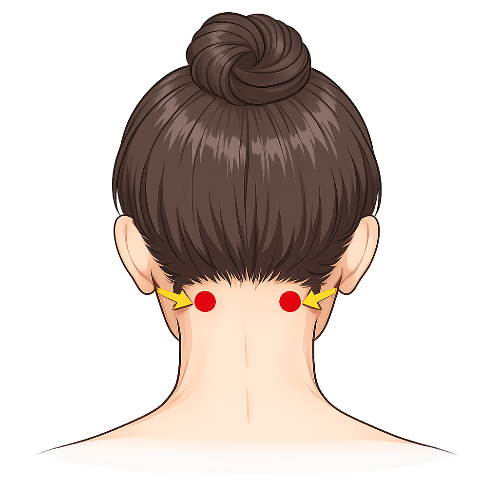 - 場所:後頭部のふち(髪の生え際あたり)で、首の太い筋肉の外側寄りにある“くぼみ”